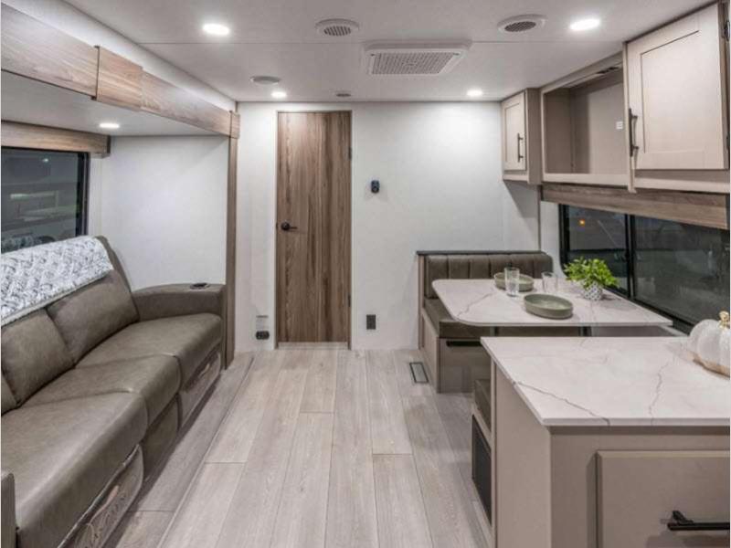 Sleeps 8 Slides 1 Length 29 ft 1 in Ext Width 8 ft Ext Height 10 ft 10 in Int Height 6 ft 6 in Interior Color Chocolate, Mink Hitch Weight 710 lbs GVWR 7000 lbs Dry Weight 5600 lbs Cargo Capacity 1400 lbs Fresh Water Capacity 45 gals Grey Water Capacity 32 gals Black Water Capacity 32 gals Tire Size 15" Furnace BTU 30000 btu Number Of Bunks 2 Available Beds Queen Refrigerator Type 12V Refrigerator Size 10 cu ft Cooktop Burners 3 Shower Size 30" x 36" Number of Awnings 1 Axle Weight 4890 lbs LP Tank Capacity 20 lbs Water Heater Type Tankless AC BTU 13500 btu Awning Info 18' Power w/LED Light Strip Axle Count 2 Number of LP Tanks 2 Shower Type Standard Electrical Service 30 amp Similar Floorplans