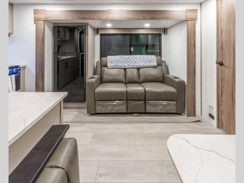 Sleeps 9 Slides 1 Length 33 ft 2 in Ext Width 8 ft Ext Height 10 ft 10 in Int Height 6 ft 6 in Interior Color Chocolate, Mink Hitch Weight 890 lbs GVWR 8800 lbs Dry Weight 6600 lbs Cargo Capacity 2200 lbs Fresh Water Capacity 45 gals Grey Water Capacity 64 gals Black Water Capacity 32 gals Tire Size 15" Furnace BTU 30000 btu Number Of Bunks 4 Available Beds Queen Refrigerator Type 12V Refrigerator Size 10 cu ft Cooktop Burners 3 Shower Size 30" x 36" Number of Awnings 2 Axle Weight 5710 lbs LP Tank Capacity 20 lbs Water Heater Type Tankless AC BTU 13500 btu Awning Info 10' & 14" Power w/LED Light Strip Axle Count 2 Number of LP Tanks 2 Shower Type Standard Electrical Service 30 amp Similar Floorplans