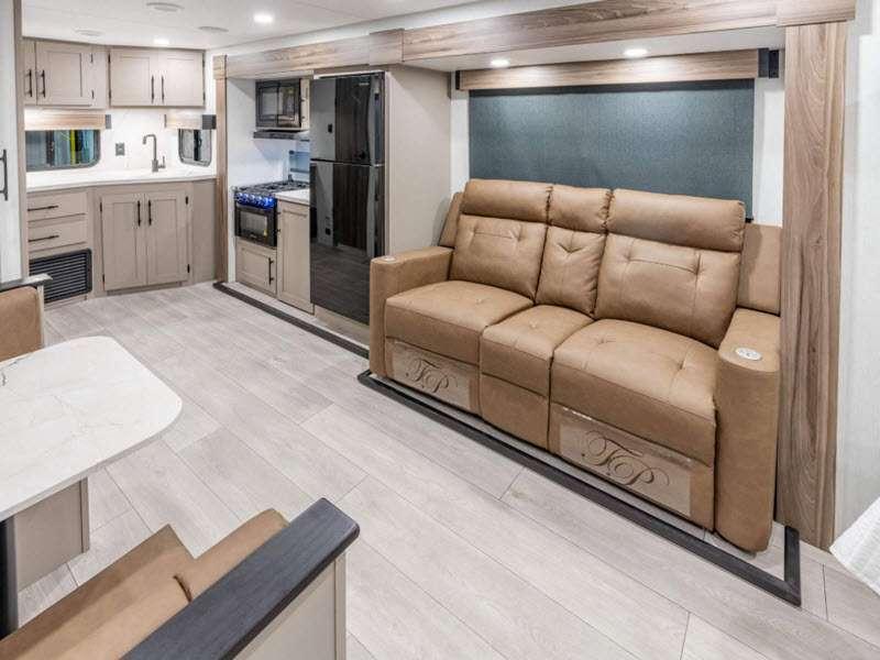 Sleeps 8 Slides 1 Length 35 ft Ext Width 8 ft Ext Height 11 ft 2 in Int Height 6 ft 6 in Interior Color Chocolate, Mink Hitch Weight 910 lbs GVWR 8800 lbs Dry Weight 7050 lbs Cargo Capacity 1750 lbs Fresh Water Capacity 45 gals Grey Water Capacity 32 gals Black Water Capacity 64 gals Tire Size 15" Furnace BTU 30000 btu Number Of Bunks 2 Available Beds Queen Refrigerator Type 12V Refrigerator Size 10 cu ft Cooktop Burners 3 Shower Size 30" x 36" Number of Awnings 1 Axle Weight 6140 lbs LP Tank Capacity 20 lbs Water Heater Type Tankless AC BTU 13500 btu Cargo Deck Size 0 ft Awning Info 20' Power w/LED Lighting Axle Count 2 Number of LP Tanks 2 Shower Type Standard Electrical Service 30 amp Similar Floorplans