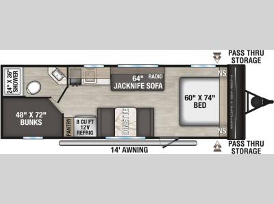 Sleeps 8 Length 27 ft 7 in Ext Width 7 ft 6 in Ext Height 9 ft 4 in Int Height 6 ft 6 in Interior Color Nomad, Mushroom Grey Hitch Weight 440 lbs GVWR 5600 lbs Dry Weight 4120 lbs Cargo Capacity 1480 lbs Fresh Water Capacity 36 gals Grey Water Capacity 26 gals Black Water Capacity 26 gals Tire Size 15" Furnace BTU 20000 btu Number Of Bunks 2 Available Beds Queen Refrigerator Type 12V Refrigerator Size 8 cu ft Cooktop Burners 2 Number of Awnings 1 Axle Weight 3680 lbs LP Tank Capacity 20 lbs Water Heater Type Tankless AC BTU 15000 btu Awning Info 14' Power Axle Count 1 Number of LP Tanks 1 Shower Type Neo-Angled Similar Travel Trailer Floorplans