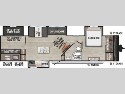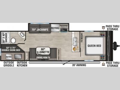 Each model includes an outside shower with hot and cold water, a power awning, as well as exterior speakers to keep the party going. You will appreciate the standard Key-Alike locks for the entry and baggage doors to keep your valuables secure, plus there is backup camera prep and solar roof prep, which will be great additions if you add those options. You will love the interior with new countertops, backsplash, linoleum, and cabinetry plus there is a full glass entry door that is ultra sleek!